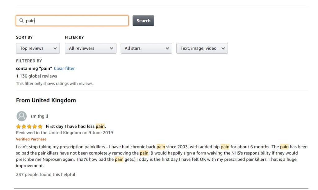 We can also see the number of customers who’ve referenced how the turmeric blend has assisted them to reduce their levels of pain, like so: